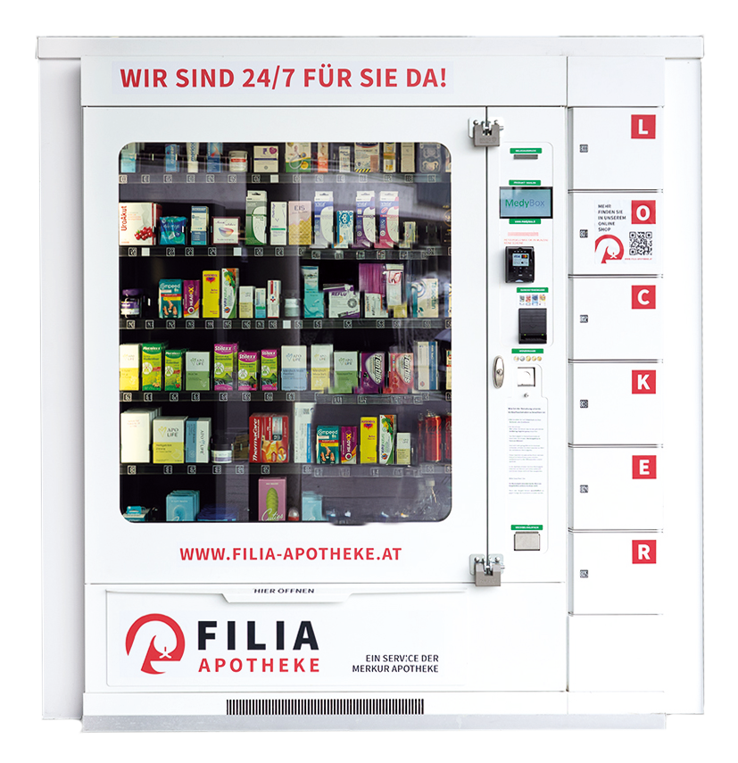 Dank unseren FILIA Apomaten haben Sie 24 Stunden, 7 Tage die Woche Zugang zu zahlreichen Produkten. Ganz ohne Nachtdienstgebühr.